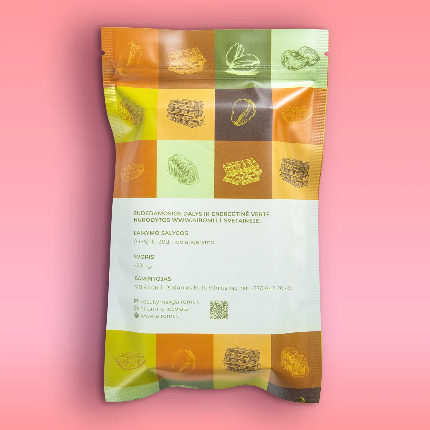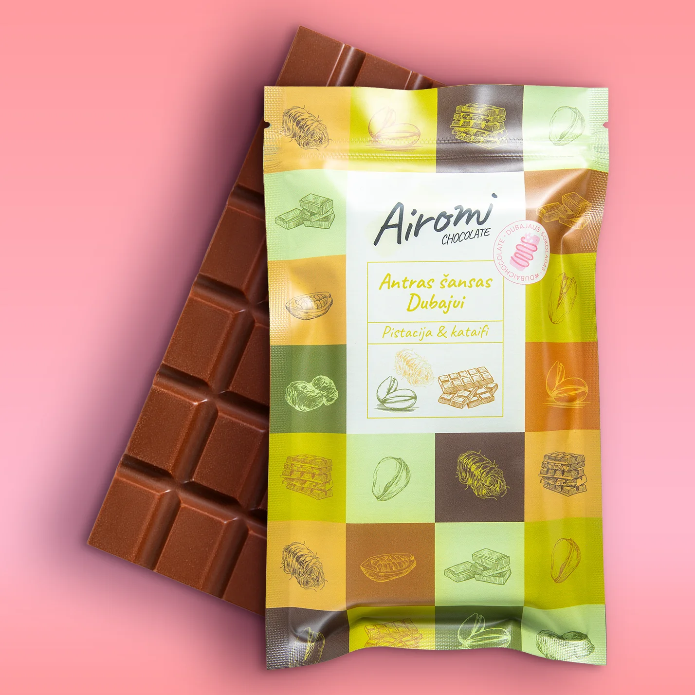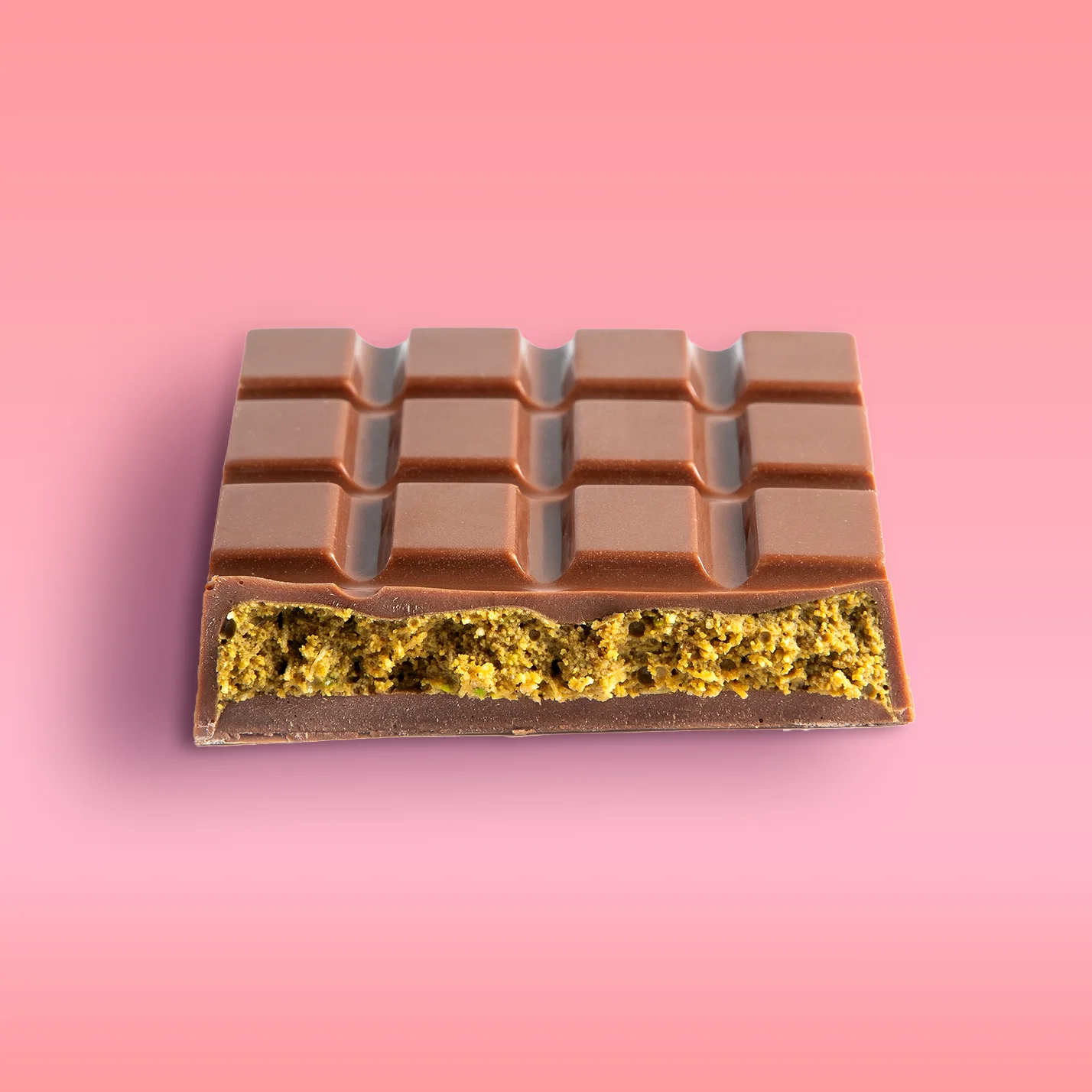 cukrus, kakavos sviestas, nenugriebto pieno milteliai, pistacijų pasta, pistacijos, sviestas, kvietiniai miltai (glitimas), gliukozė, krakmolas, vanduo, druska, kakavos masė, migdolų aliejus, saulėgrąžų aliejus, lecitinas (sojų), natūralus vanilės ekstraktas, konservantas (kalio sorbatas), dažikliai (riboflavinas, E141), emulsikliai, kviečių krakmolas.