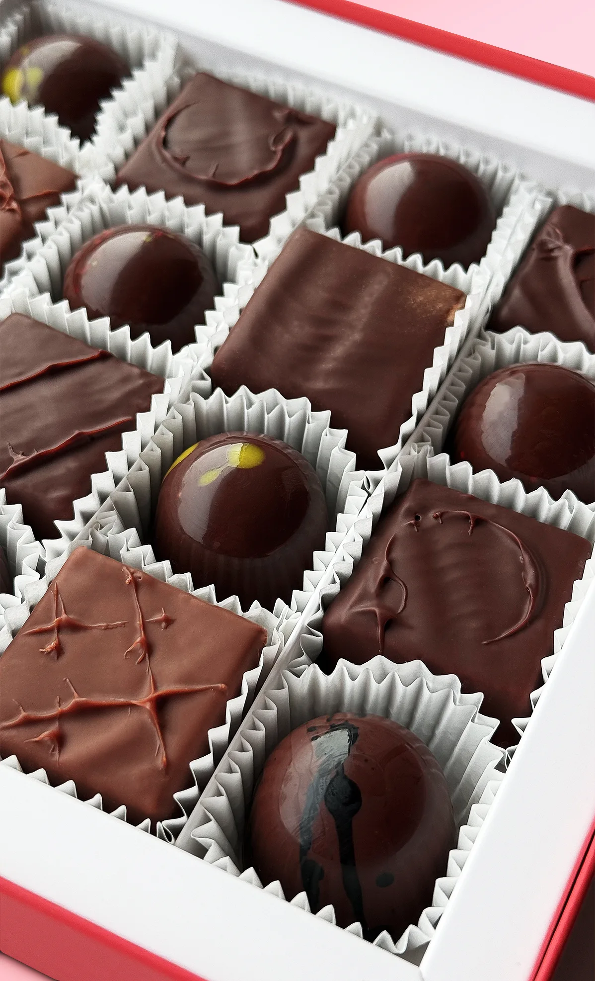 Gurmaniška degustacinė kolekcija: kruopščiai subalansuoti įdarai, šviežiai gaminami marmeladai, riešutiniai pralinė ir švelnūs ganašai, įlieti į prancūzišką Valrhona šokoladą.